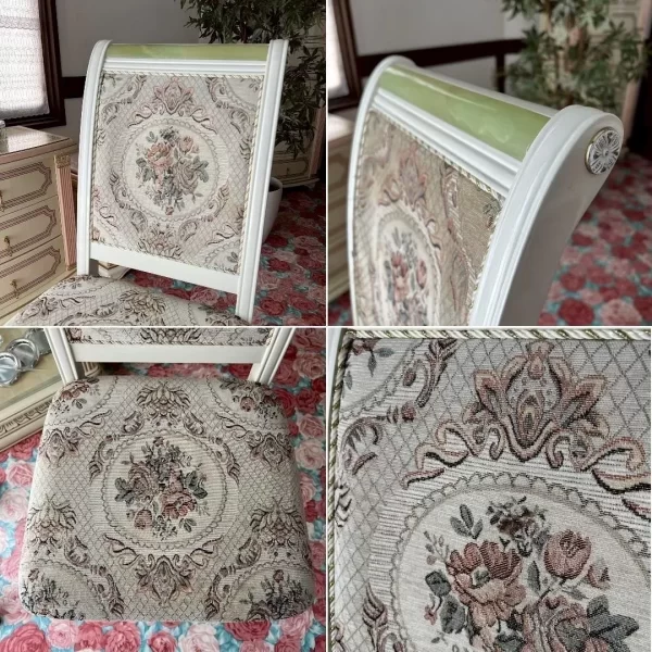 ゴブランのファブリックがエレガントなチェアにも、テーブルにもグリーンの天然石が埋め込まれ、華やかなアクセントになっております。