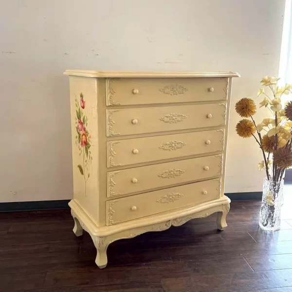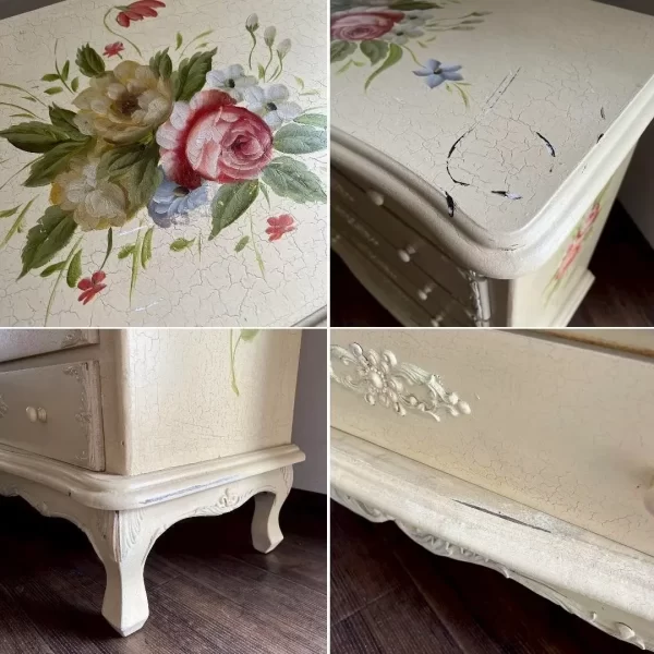 天板や側面には華やかなブーケが描かれております。引き出し内側にはボルドーの布が貼られており、なんともロマンチックな仕様になっております。