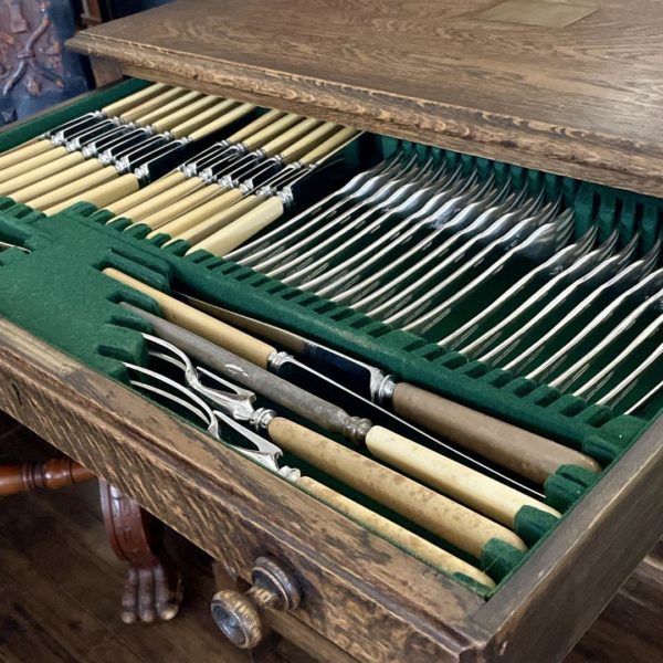 装飾の施された脚やクラシックの取っ手が美くしく装飾性と実用性を兼ね備えたカトラリーチェストです。