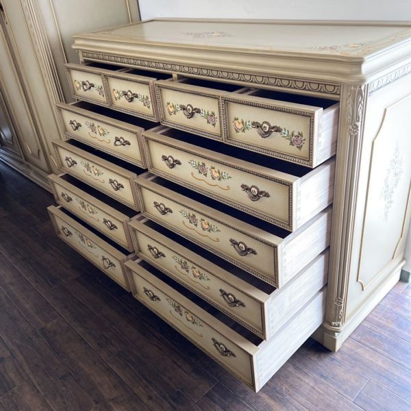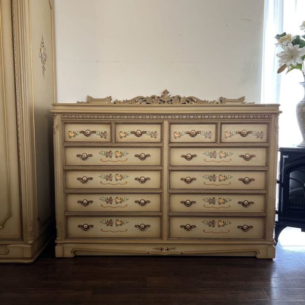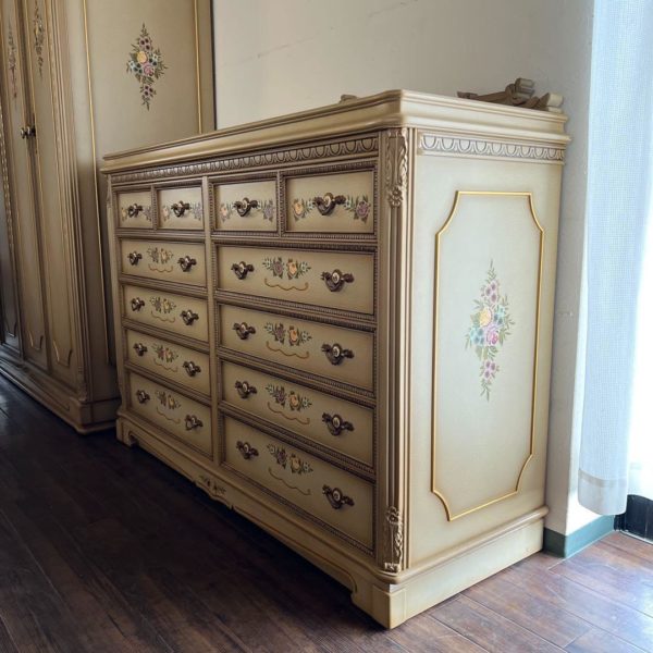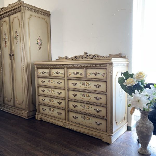 クリーム色の花柄装飾が施された木製のアンティーク風キャビネット