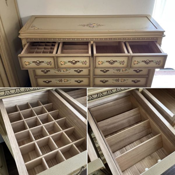 引き出しの前板から天板とサイド面、全てアンティーク・クラック仕上げとなっております。引き出しのインナーはこだわり桐仕様です。