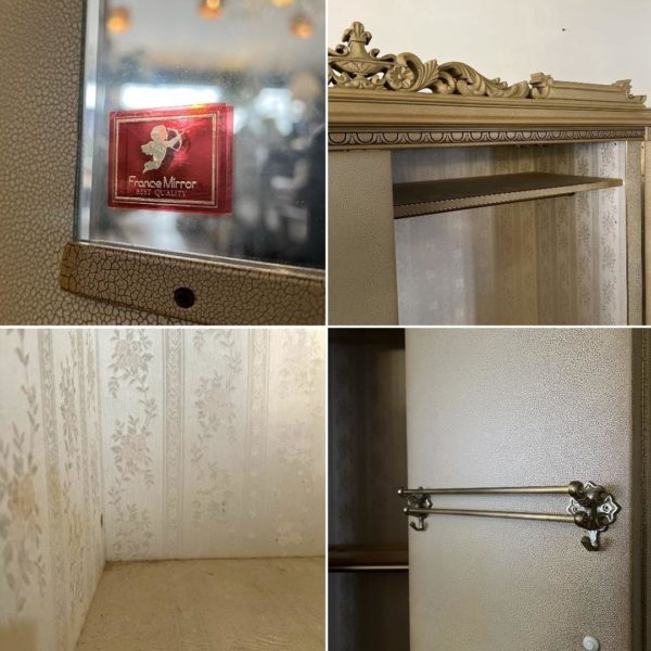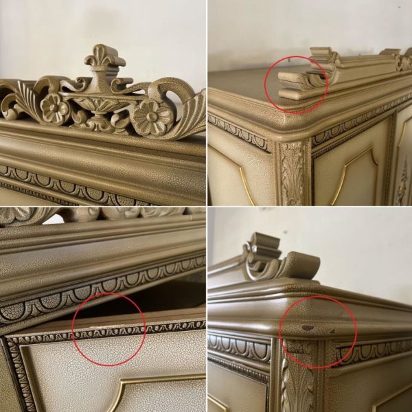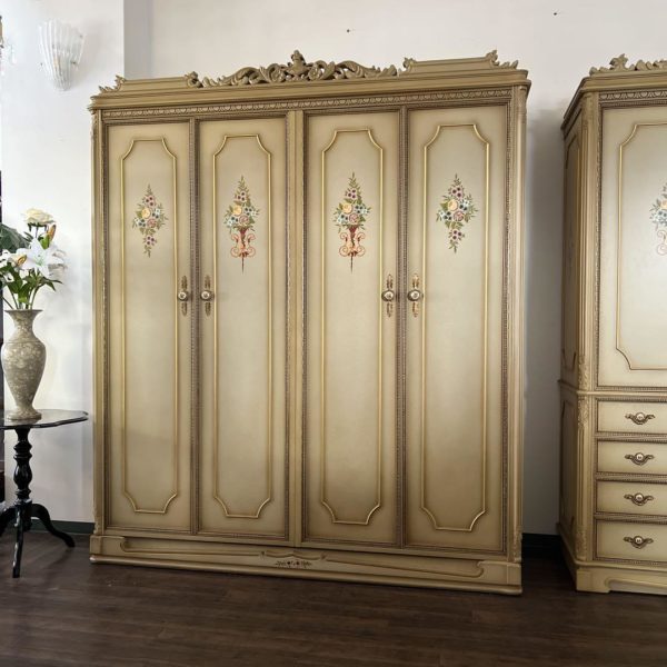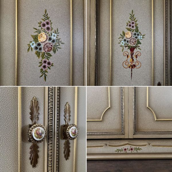 クリーム色の花柄装飾が施された木製のアンティーク風キャビネット