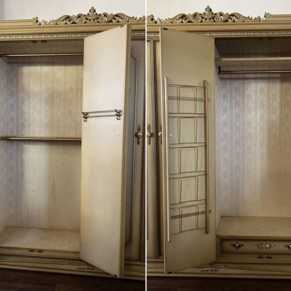 クラシックスタイルの4枚扉キャビネットには装飾的な上部キャノピー付き。造りといたしましては、左右2枚の扉ごとに空間が別れております。